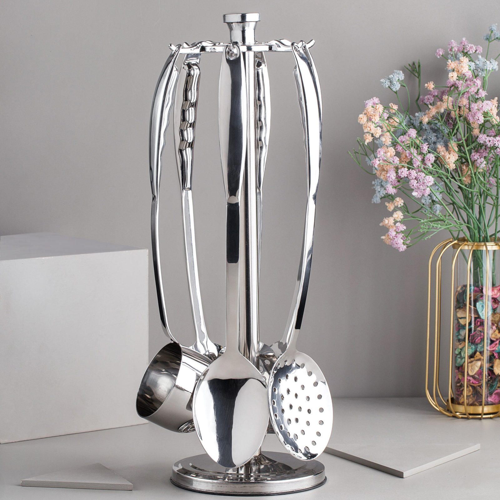 • The stainless steel stand keeps the utensils neatly arranged and easily accessible, adding functionality to your kitchen space.